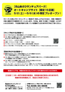 初の試みとして5月2日〜5月6日の間、月山あさひサンチュアパーク内オートキャンプサイトを限定15区画でプレオープンいたします。
