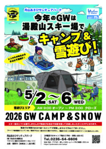 2026.ゴールデンウイークの5月2日から5月6日の間、「月山あさひサンチュアパーク」および「湯殿山スキー場」を運営する株式会社月山あさひ振興公社と鶴岡市地域おこし協力隊が、「GW キャンプ&スノー」と題して雪遊びとキャンプが楽しめるイベントを開催いたします。